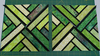 Elizabeth likes us to cut the quilt out in the morning and then we get to sew the afternoon way knowing the quilt blocks are all cut and ready to sew. Now I didn't do any sewing as I only started cutting on lunchtime but that is ok. Everyone else did manage to finish 8 sections to complete 2 blocks. Here they are they will be all different. Tina's quilt will be a favourite of mine and if she hadn't used Tula Pink's Tabby Road I probably would have myself.